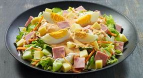 Μείγμα σαλάτας fan με μαρούλι - iceberg, λάχανο λευκό, ρόκα, καρότο, κυβάκια φρέσκιας ντομάτας, κυβάκια τυρί gouda, ζαμπόν, κυβάκια αγγούρι, αυγό & sauce 1000 νησιά. Συνοδεύεται από 1 μερίδα αλάτι