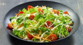 Μείγμα σαλάτας fan με μαρούλι - iceberg, λάχανο λευκό, ρόκα, καρότο, ντοματίνια, πιπεριά πράσινη. Συνοδεύεται από μπωλάκι βινεγκρέτ εσπεριδοειδών & 1 μερίδα αλάτι