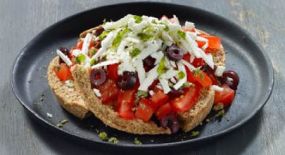 Σαλάτα με παραδοσιακή Κρητική κριθαροκουλούρα, κυβάκια ντομάτας, φέτα, ελιά & ρίγανη. Συνοδεύεται από ελαιόλαδο & 1 μερίδα αλάτι