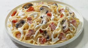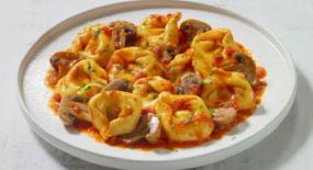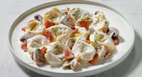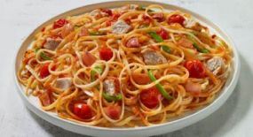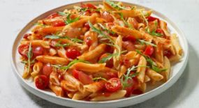Σαλάτα με ζυμαρικά fusilli, ντοματίνια, πιπεριά τρίχρωμη, ρόκα, καλαμπόκι, κεφαλοτύρι, μαϊντανό & sauce Fan.