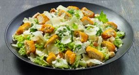 Σαλάτα με κοτομπουκιές πανέ (5 τμχ), γαλλική σαλάτα, flakes παρμεζάνας, κεφαλοτύρι, κρουτόν. Συνοδεύεται από sauce Caesar`s & μερίδα αλάτι