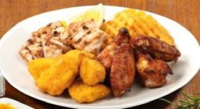Mega Smartbox Regular Περιλαμβάνει μία πίτσα 12 τεμαχίων, 8 Τεμάχια φτερούγες κοτόπουλο, 10 τεμάχια onion rings, 1 sauce BBQ, 1 sauce μαγιονέζα & 1 μερίδα πατάτες crosscut