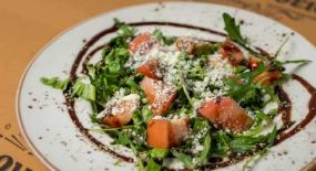 (σαλάτα με ρόκα, ντοματίνια, βαλσάμικο, ελαιόλαδο & παρμεζάνα)